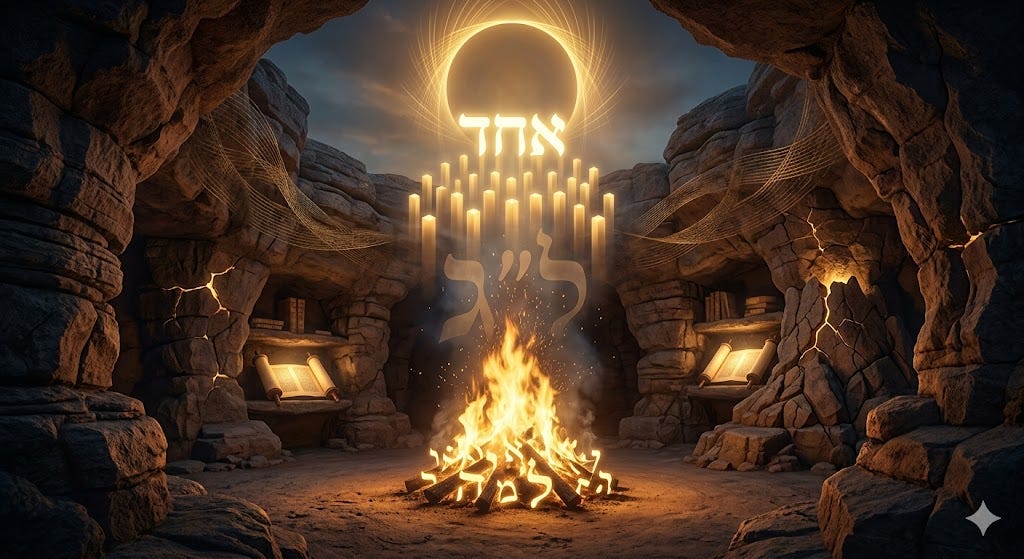 An idea of the Gra’s here is stunning. There are six words in שמע ישראל and six words in ברוך שם כבוד מלכותו לעולם ועד. If the five words of שמע before אחד correspond to the חמשה חומשי תורה (Five Books of the Torah), then ברוך שם is already the quieter, hidden side, the lower voice, the concealed resonance beneath the open declaration. רבי עקיבא dies on אחד because he is the connector between the two. He is not only the אב של תורה שבעל פה. He is the bridge that binds תורה שבכתב and תורה שבעל פה, the outer תורה and the inner תורה, the revealed declaration and the hidden response. He is the man of חיבור (connection).